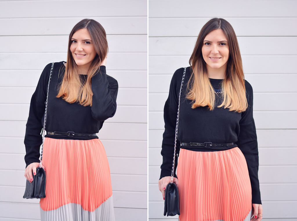 Contrairement aux apparences, il ne s’agit pas d’une jupe mais d’une robe. C’est d’ailleurs celle que je portais ici lors du mariage civile de mon frère en juillet dernier. Elle est parfaite les filles ! Non, non, je n’exagère pas. Elle a la taille marquée, est vaporeuse, ce qui lui donne tout de suite un air très féminin. Les couleurs pastels sentent bon les beaux jours qui arrivent, on a envie de danser avec elle… Quant au détail du plissé, il apporte tout à cette pièce super trendy.